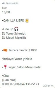 La fiesta, con adolescentes como supuestos organizadores, debía ser pagada mediante transferencia bancaria –tal cual se observa en la captura de pantalla- con lo que, claramente, se trata de adultos a cargo de la recaudación, en razón del CBU, ofrecido.
