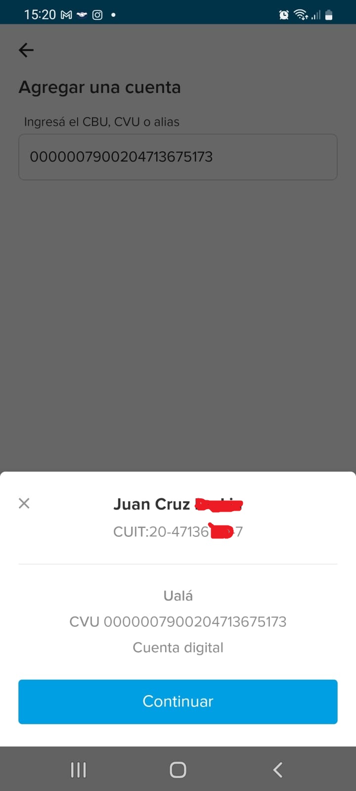 La cuenta asociada refería a un CVU, en realidad, que es una Clave Virtual Única perteneciente al titular de una billetera de la empresa “UALA”. Uala permite la entrega de tarjetas a menores –mayores de 13 años- con autorización expresa de sus padres, como a su vez para realizar la adjudicación al menor y generar un CUIT, requerido por la empresa de pagos para reconocer la actividad fiscal del menor. Para este trámite, en la AFIP, se debe presentar el DNI del menor y CUIL o CUIT del padre/madre biológica o padres adoptivos, según corresponda.