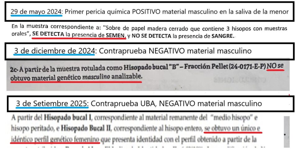 El 3 de diciembre de 2024, el Laboratorio Forense informó que en los hisopos solo se encontró un perfil genético femenino: el de la propia menor. No se obtuvo material genético masculino.