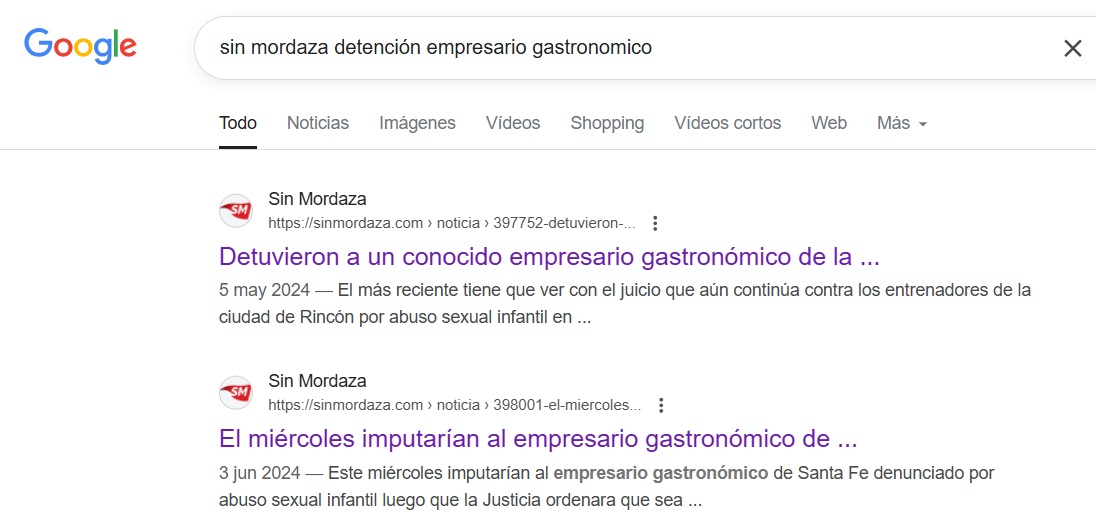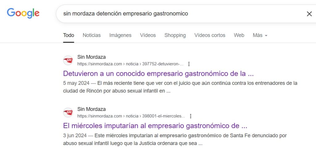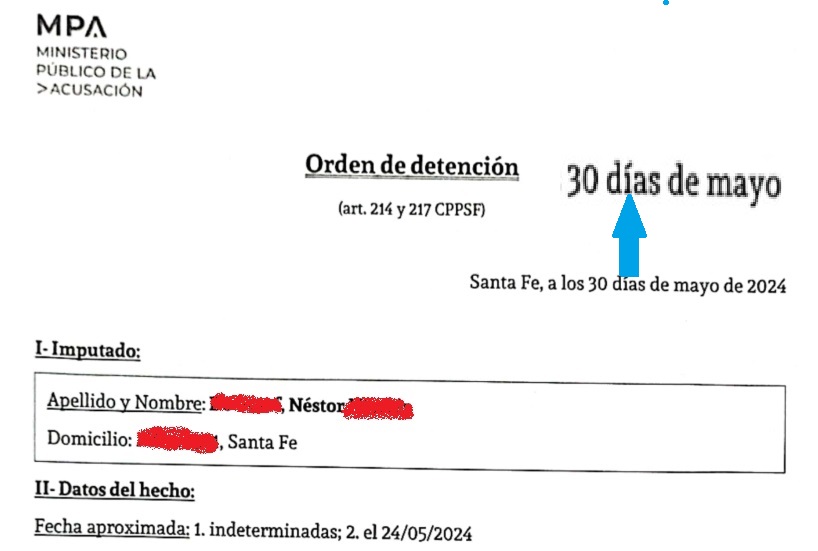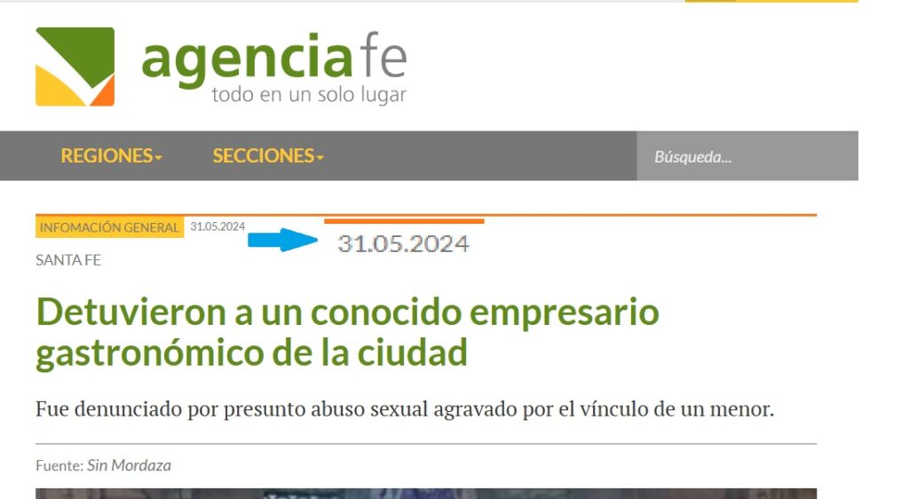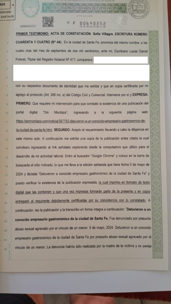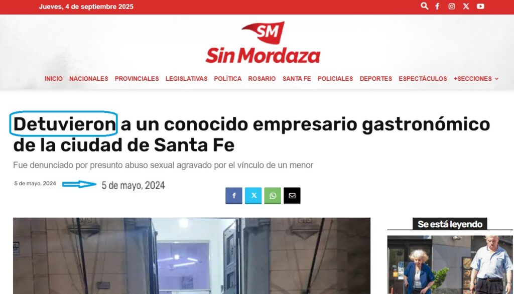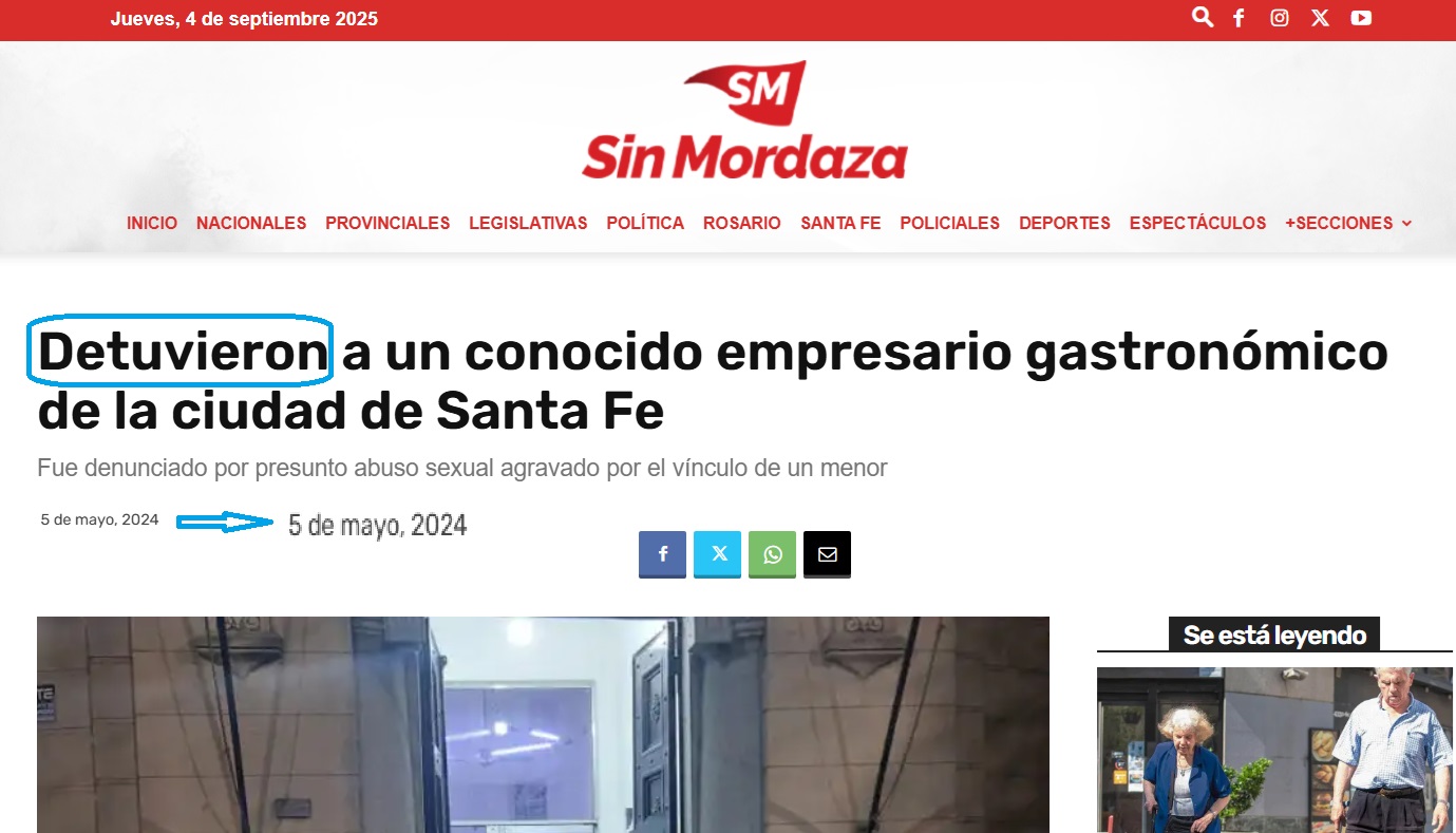 Con fecha 5 de mayo de 2024, el sitio www.sinmordaza.com titulaba: “Detuvieron a un conocido empresario gastronómico de la ciudad de Santa Fe”. (VER) Algo que en realidad sucedería 28 días después, el 1 de junio a las 15 horas en el Hospital Cullen —según el informe del fiscal Broggi a la OGJ—. En el cuerpo de la nota, se daban detalles de la denuncia realizada por Scataglini