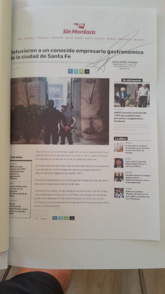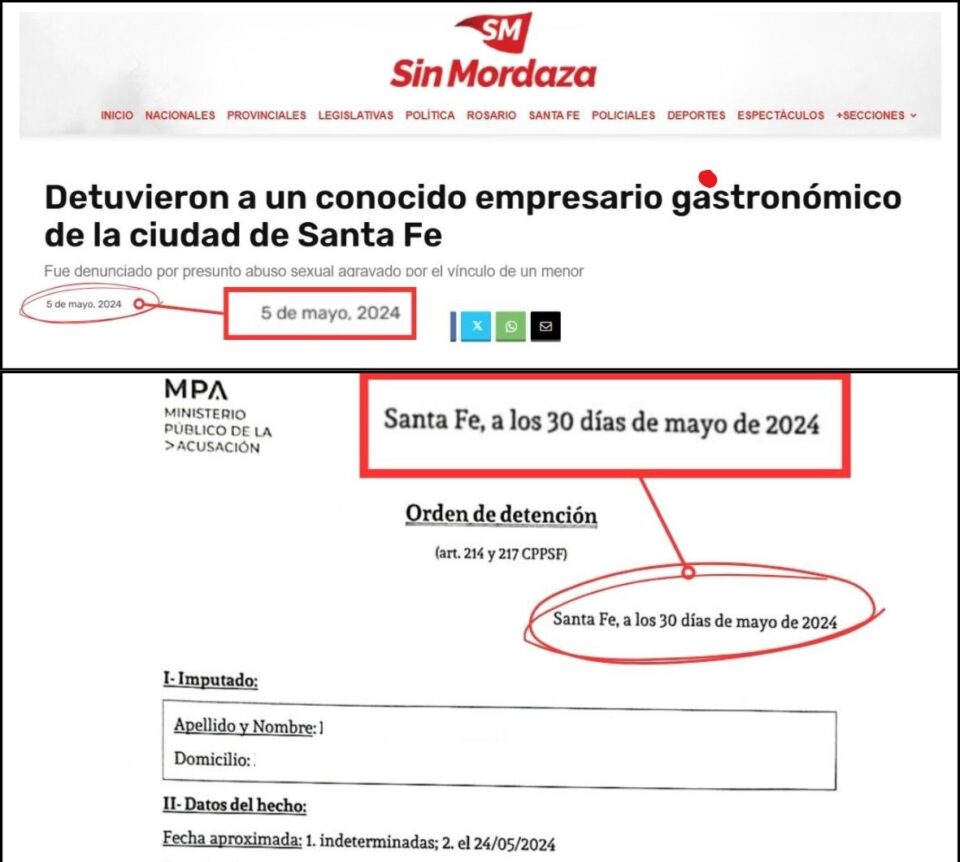 Con fecha 5 de mayo de 2024, el sitio www.sinmordaza.com titulaba: “Detuvieron a un conocido empresario gastronómico de la ciudad de Santa Fe”. (VER) Algo que en realidad sucedería 28 días después, el 1 de junio a las 15 horas en el Hospital Cullen —según el informe del fiscal Broggi a la OGJ—. En el cuerpo de la nota, se daban detalles de la denuncia realizada por Scataglini: “La denuncia habría sido realizada por la madre de la víctima y ex pareja del sospechoso”. Eso recién ocurriría más adelante. Agregaba un dato de la acusación que posteriormente se desestimó: “Además, el presunto tráfico de imágenes de pornografía infantil”. Tal imputación hacía alusión a una foto de Instagram publicada por el padre, en la que aparecía tonteando con su hijo en malla y con una flor; una imagen que solo podría interpretarse como sexual por una mente enferma.